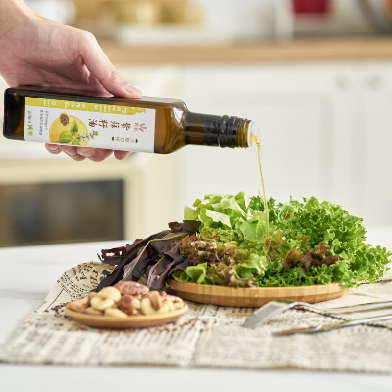 紫蘇讓人印象深刻的是它有一股獨特的香氣,這個是因為它含有多酚類物質「紫蘇醛」而產生的香氣。而且紫蘇油的味道十分自然清香,是個清爽好入口的油品,不管是直接飲用,或者是作為生菜及各類料理的涼拌添加也很適合喔。