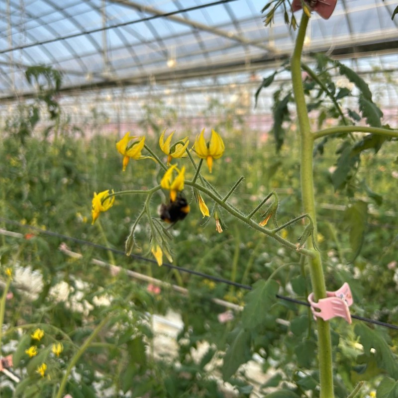 黃色的小花朵朵開,辛勤的熊蜂穿梭在葉片間,採集花蜜與花粉,也順道替了作物授粉。一串串轉色中的小番茄,從底部的綠果,漸漸向上延伸出繽紛的色彩。