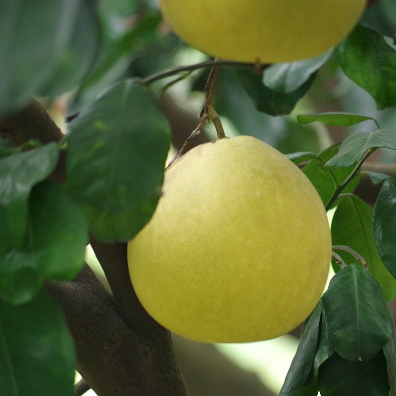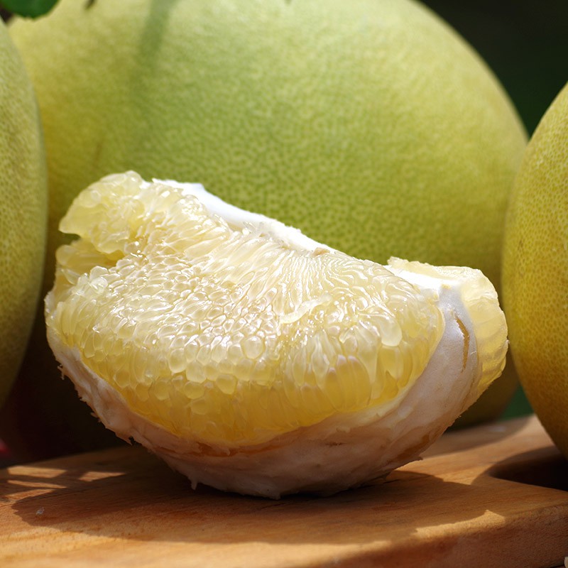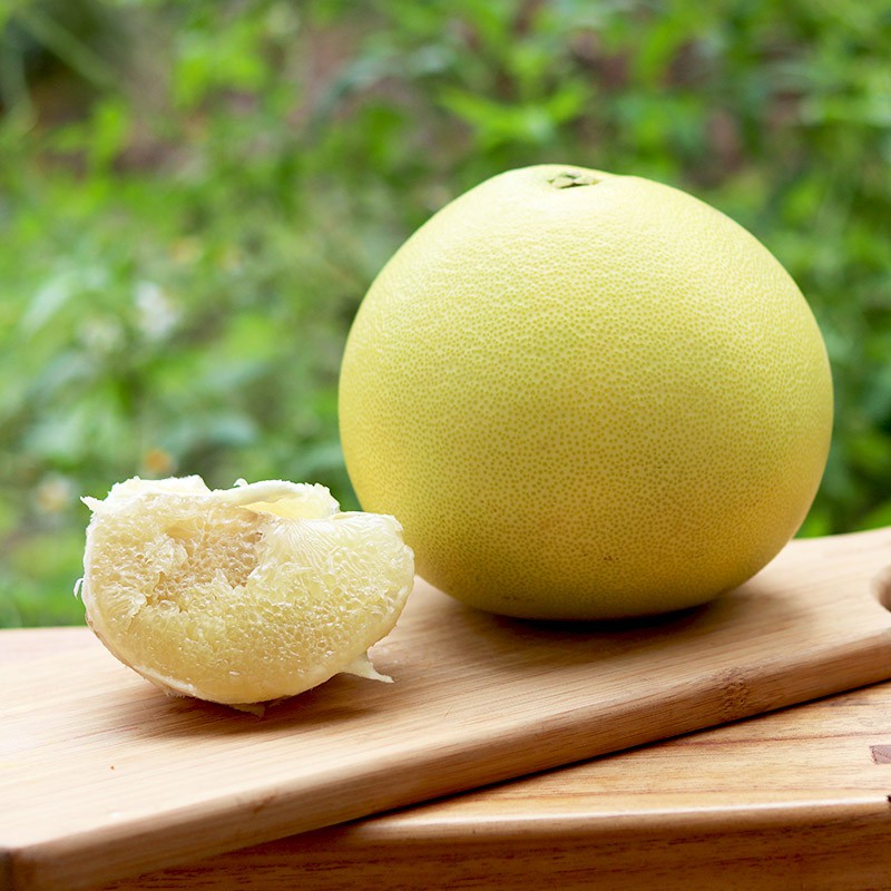 大白柚的產期較文旦晚,約在10月中至11月初,成熟是果色為暈染般的黃綠色,觸感光滑好摸,捧在手中有沉重感,因其肉多豐厚,飽含源源的水分,吃起來更為過癮: